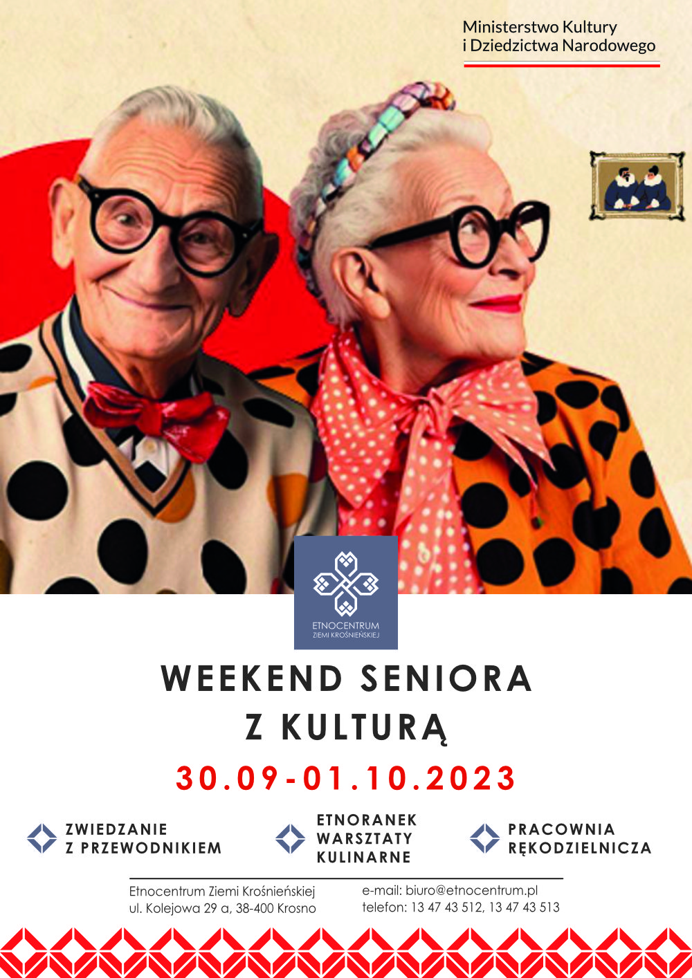 Zapraszamy seniorów do Etnocentrum Ziemi Krośnieńskiej na bezpłatne zajęcia w ramach "Weekendu seniora z kulturą": oprowadzanie z przewodnikiem i warsztaty rękodzielnicze, a także na Etnoranek za symboliczną "piątkę"!
