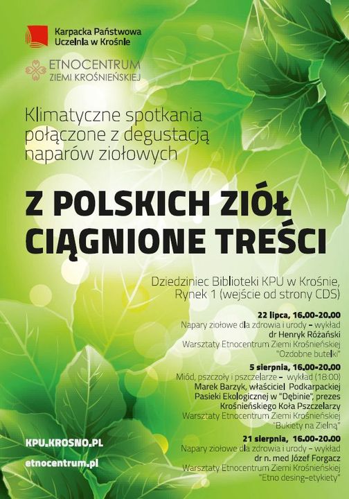 Wspólnie z Karpacką Państwową Uczelnią w Krośnie zapraszamy na klimatyczne, zielarskie spotkania 22 lipca, 5 sierpnia i 21 sierpnia na dziedzińcu Biblioteki KPU. W czasie warsztatów prowadzonych w godzinach 16:00 - 20:00 nasze rękodzilniczki zaprezentują jak samodzielnie ozdobić butelkę, jak wykonać bukiet lub wianek z naturalnych kwiatów i ziół oraz jak stworzyć własną, niepowtarzalną etykietę.